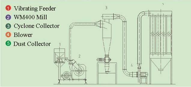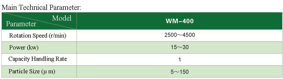 The crushing rotor is consist of several horizontal discs and blades. These consist many stagger arranged crushing chambers. The air in the small chamber is elastic, can vibrate tinily and freely. When the rotor runs, the speed of peripheral circle can reach more than 84 m/s. The airflow velocity between rotor and ring gasket can be almost 55m/s. Because of the airflow impact, there will be 400015000 times tiny vibration occur in the rotor crushing chamber. And there will be a 140 DB audible ultrasonic wave in this chamber, and will cause 0.025 atmosphere pressure difference. Then the jet flow and vortex of sound generate the mutual friction and impact of the powders and the powders becomes smaller. The crushing rate and powder fineness is better than the impact machines.