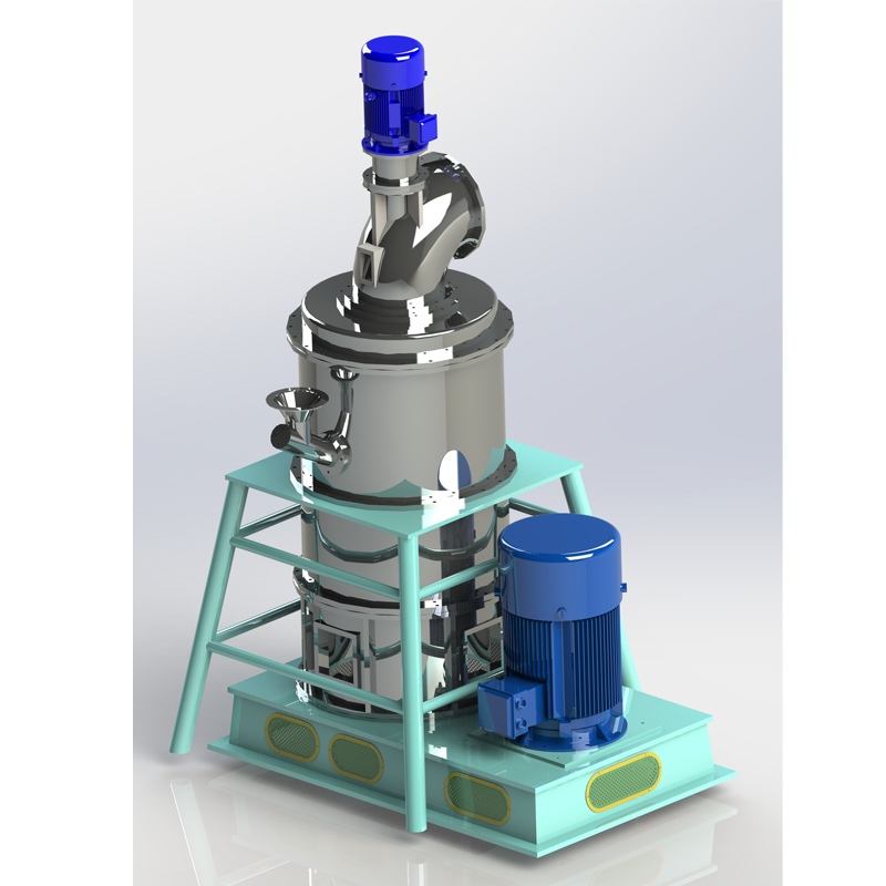 The grading motor drives the grading wheel to rotate, forming a graded effect on the powder. The size of the finished product can be adjusted by the speed of the grading wheel. The coarse particles that do not meet the requirements are thrown by the blades toward the outer wall and fall into the grinding chamber to continue grinding. The particles that meet the requirements pass through the leaves and form a gas-solid two-phase flow, which is sucked into the cyclone collector, and the airflow and powder After the particles are gas-solid separated, the powder particles are collected.